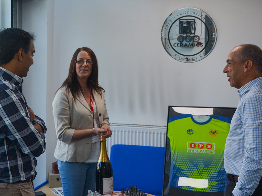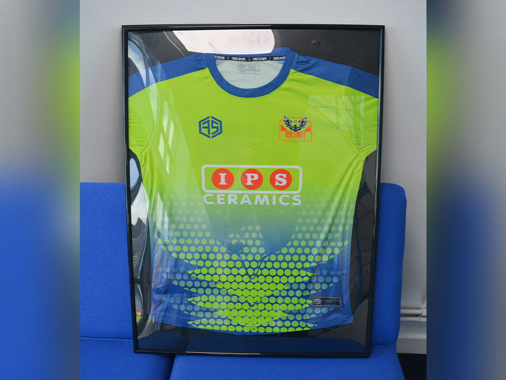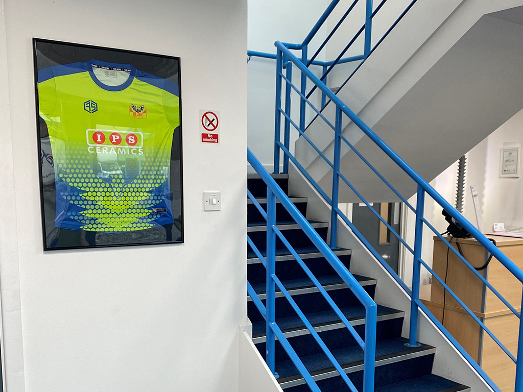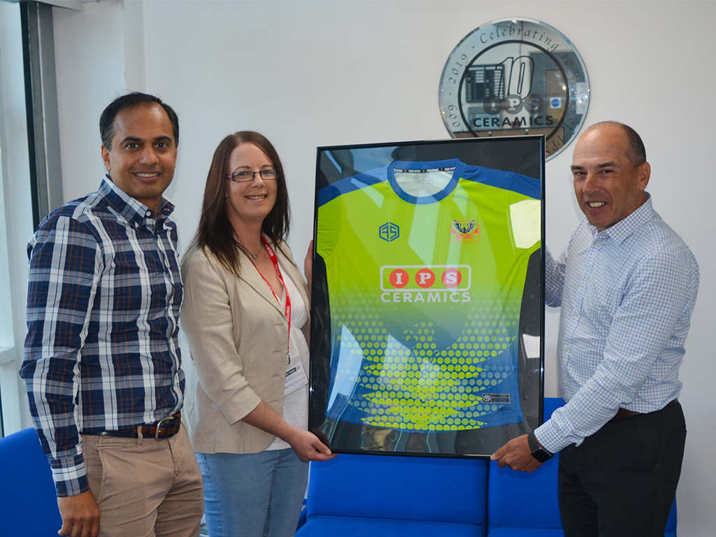 To show their thanks, team manager Nikki Rackham came to the IPS Ceramics offices to present IPS Ceramics with a framed copy of the team shirt. Receiving the shirt were Sukhjinder Singh (CEO) and Ian Wright (Operations Director). It is now proudly displayed in our office reception.